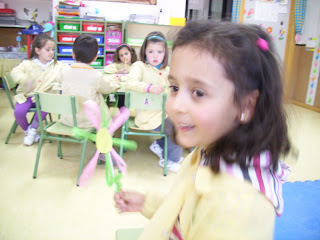 Esta mañana nuestra compañera Raquel nos ha traído una nota de su mamá que nos decía que la niña había aprendido a hacer estas flores: